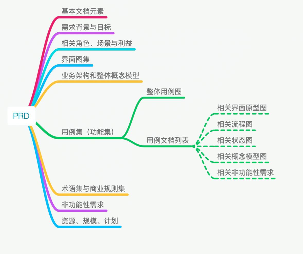 - 每个用例中包含流程,涉及到相关界面、流程图、状态图、商业规则时,包含进来。