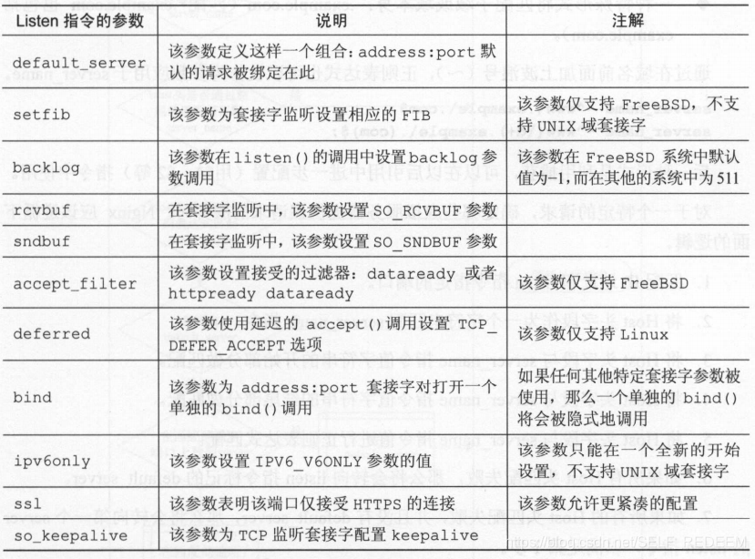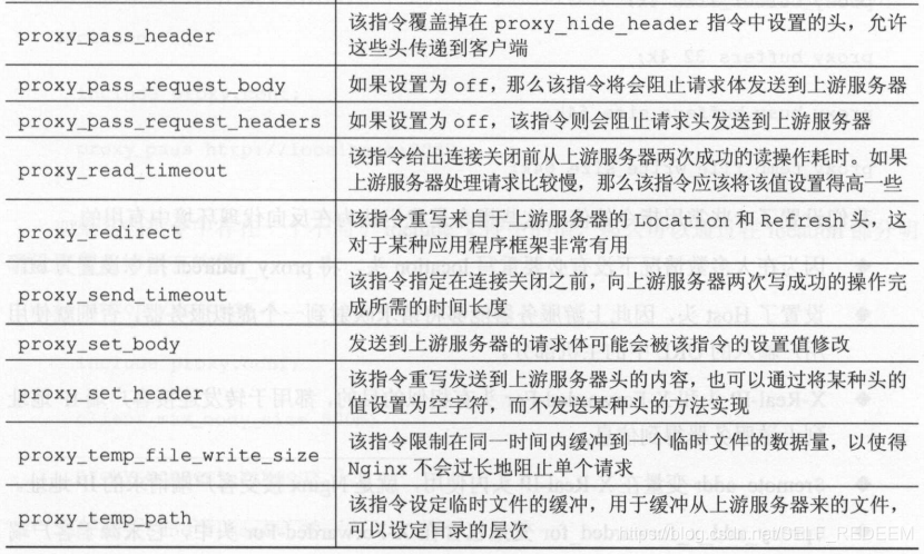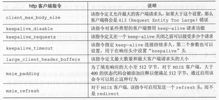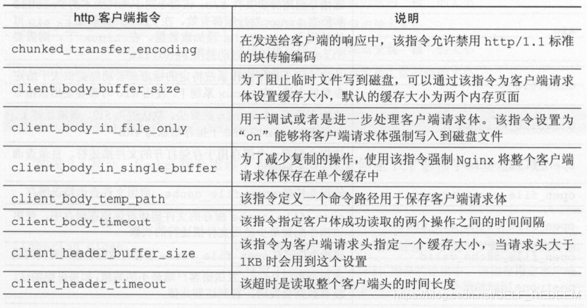 表中给出了每个配置项对应的含义,个人觉得client_max_body_size这一项的解释有误,该指令定义的应该是运行最大的客户端请求体,在其他资料中已证实了该配置项确实是限制客户端请求体的。