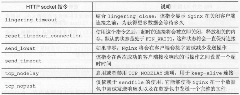 除了以上配置,Nginx允许定义HTTP请求中的网络连接配置, 配置项如下