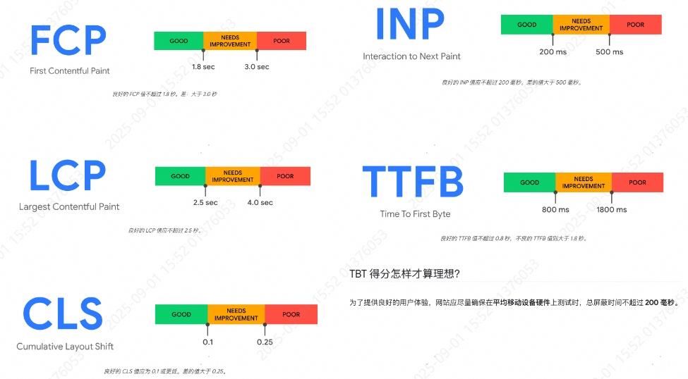 - 累积布局偏移 (CLS):衡量网页开始加载到其生命周期状态更改为“隐藏”之间发生的所有意外布局偏移的累计得分。
