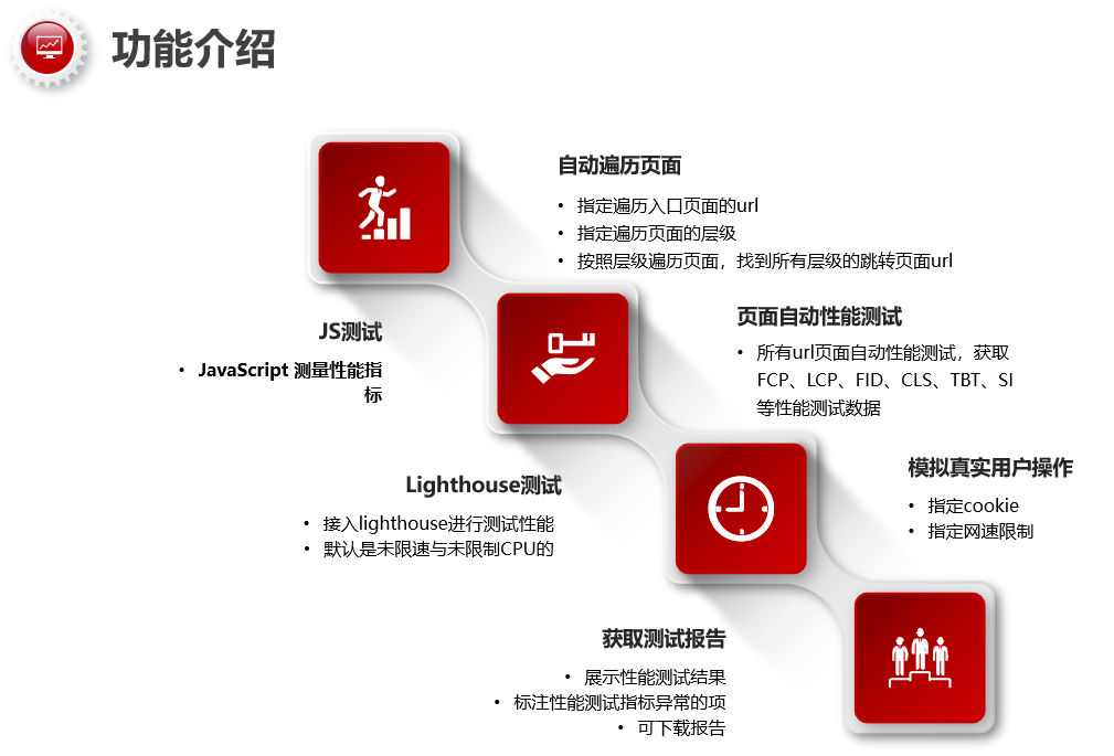 2、前端页面遍历自动完成性能测试,自动化测试与性能测试相结合,自动遍历页面模拟用户操作路径,快速输出真实反映用户操作数据的测试报告。