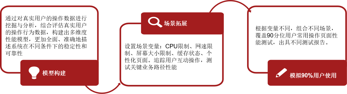 在明确影响用户页面性能的因素后,统计分析生产环境真实用户的使用数据,按照影响因素、用户核心使用场景与操作路径得到性能测试场景集,进而确保测试结果能够反映生产环境中90%用户的真实使用场景。