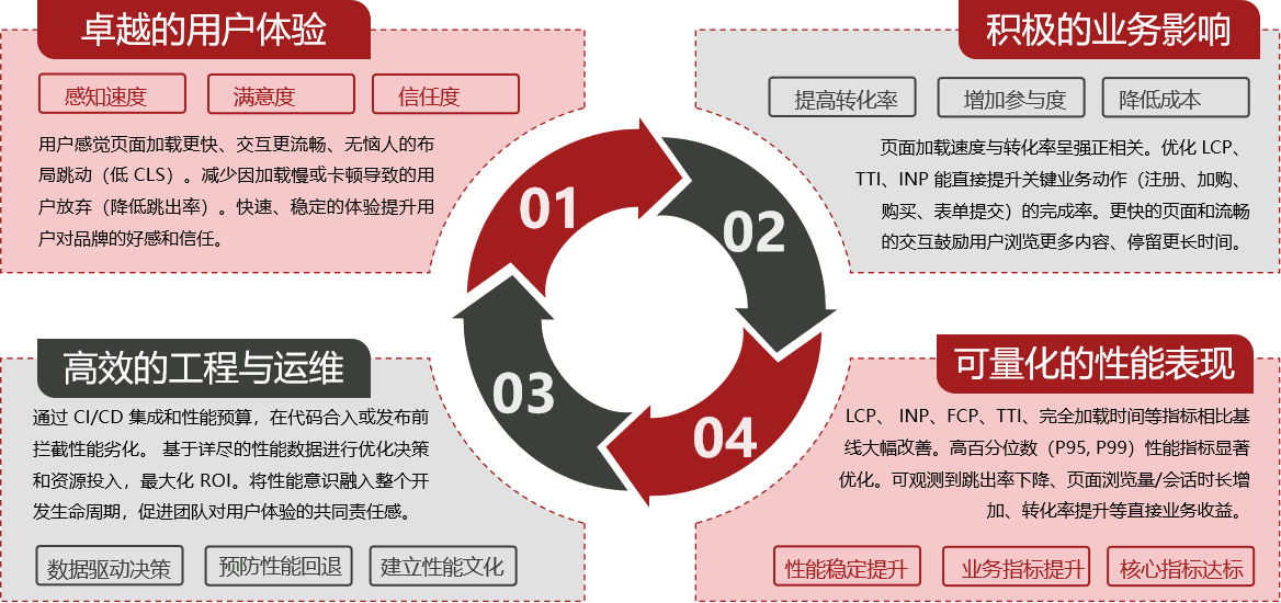 ● 数据驱动原则:通过真实用户监控(RUM)数据定位高频路径和性能瓶颈。