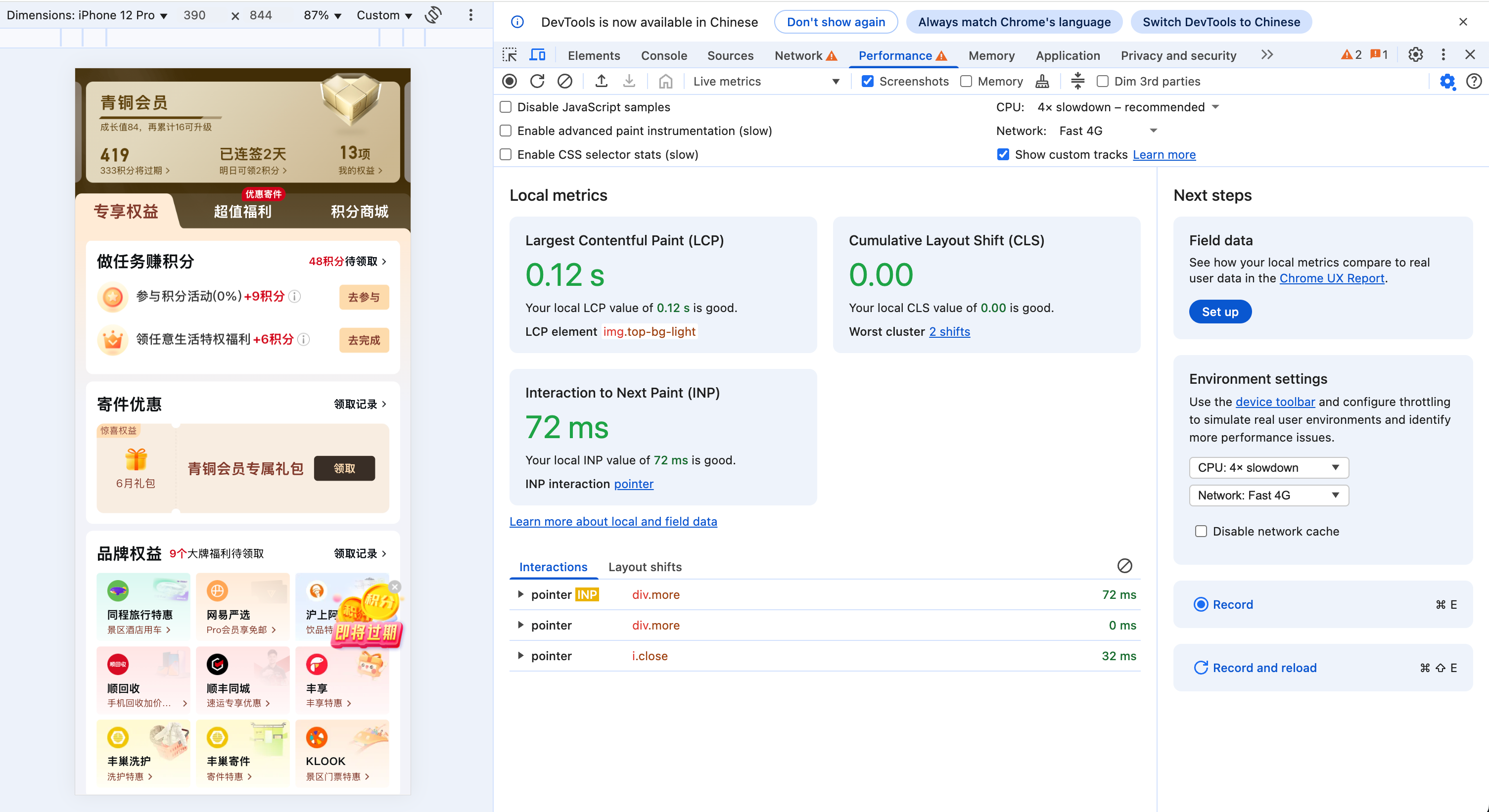 谷歌开发者工具中的性能面板,分析网站性能。可设置CPU、网络速度、设备模式,可实时观察LCP、CLS、INP(与网页互动才会捕获到INP),也可以点击录制分析运行时的性能。