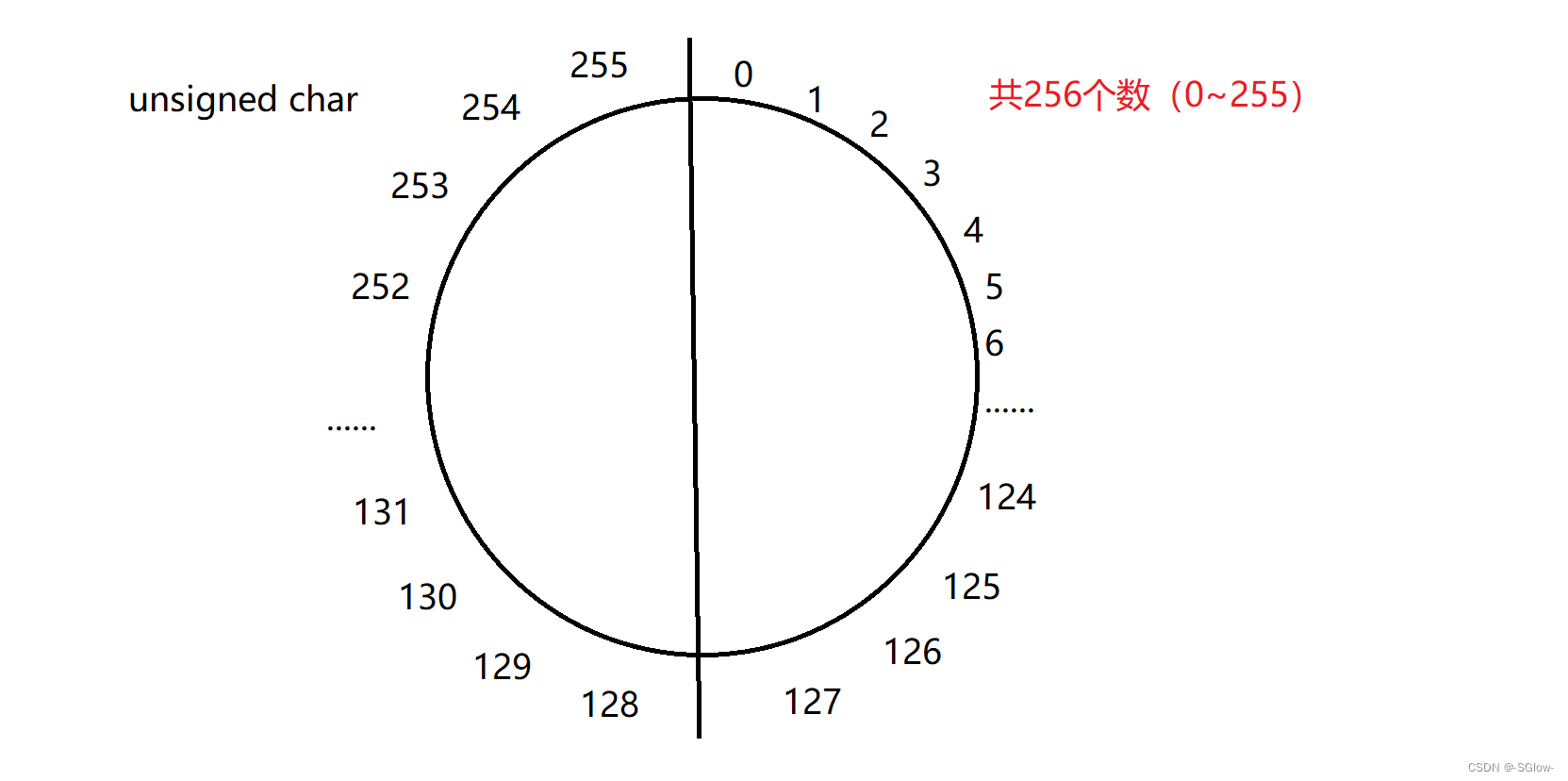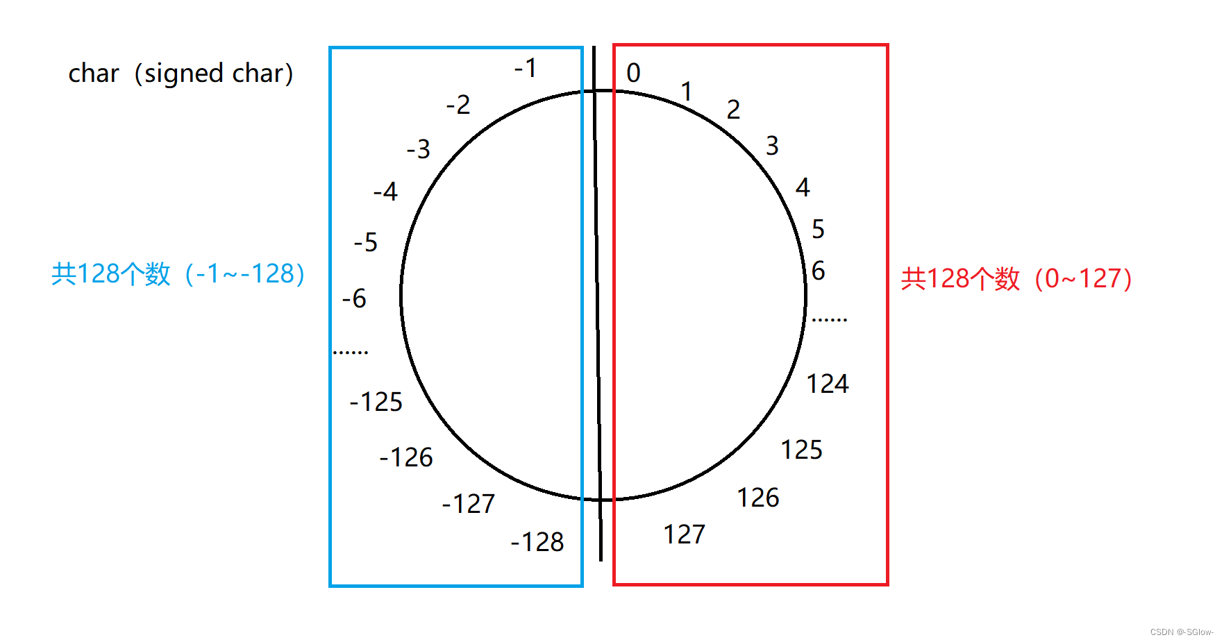 由于char 只有8个bit位的存储空间,所以它最多能表示256个数字(包含0),但在signed char中,由于存在原反补的存储规则,导致01111111是最大的正数,对应过来是127,如果再加,就会是10000000,除符号位按位取反+1得到1 00000000,截断后本应是0,但这和0000000冲突了,也就是说0会出现两次,因此规定在这种情况下,127+1 = -128。再往后+1得10000001,除符号位按位取反得11111110,+1得11111111,对应的就是-127,以此类推。