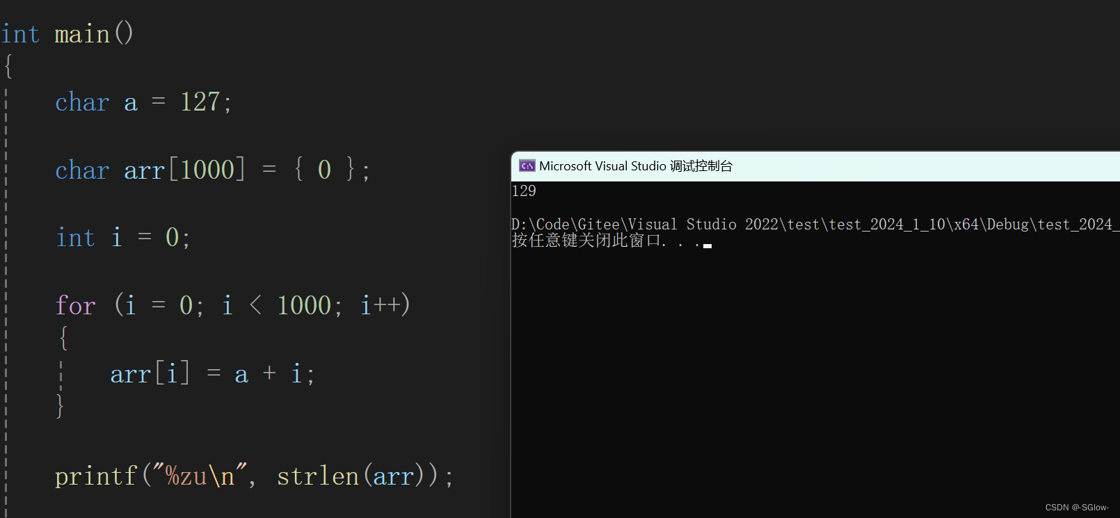 实际识别到0(也就是\0)就停止了,因此用strlen识别出的大小是129