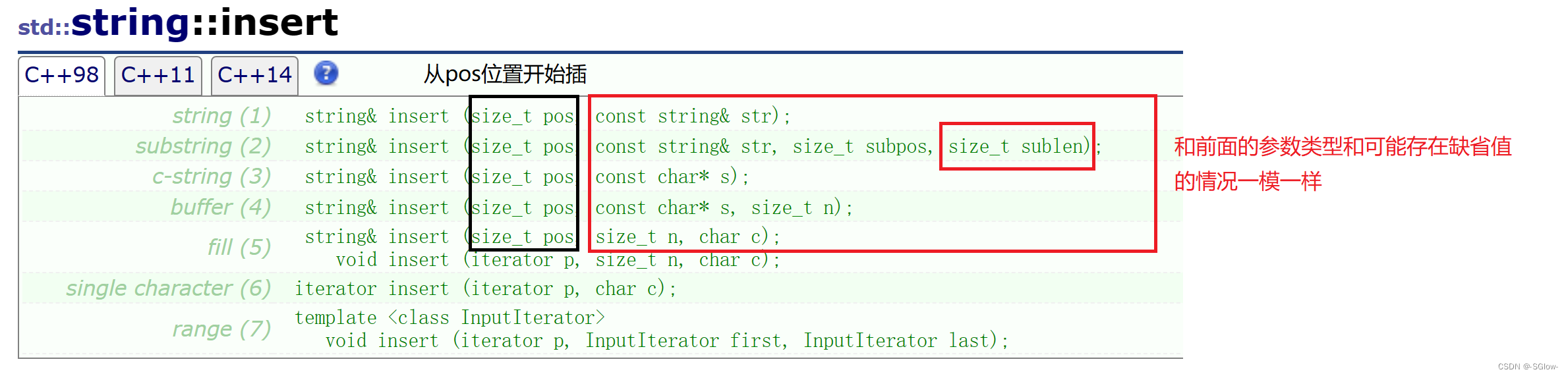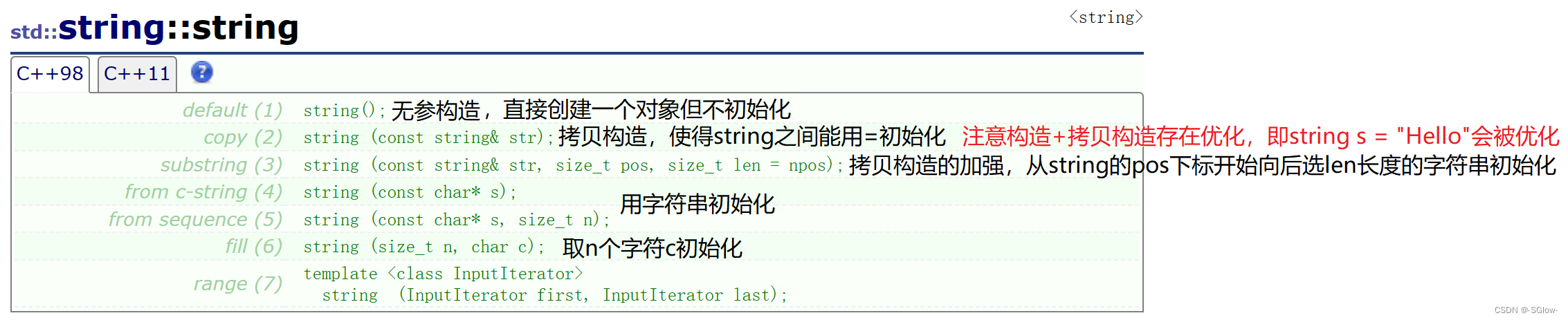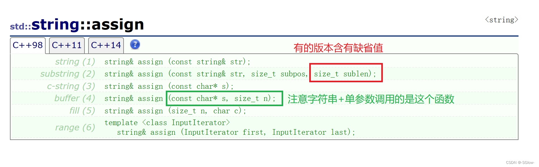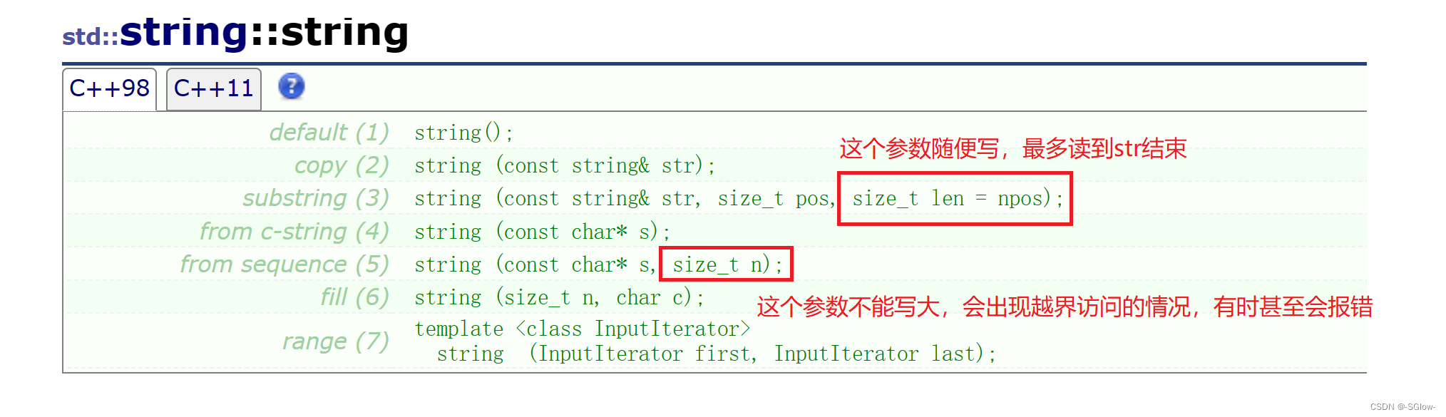 但是我们要注意的是这里面有很多的构造函数,在使用的时候是去找最匹配的。我们有时候使用的构造函数带有缺省值npos,但有的有没有,这就导致了有些函数容易造成我们理解上的歧义,需要我们着重理解。