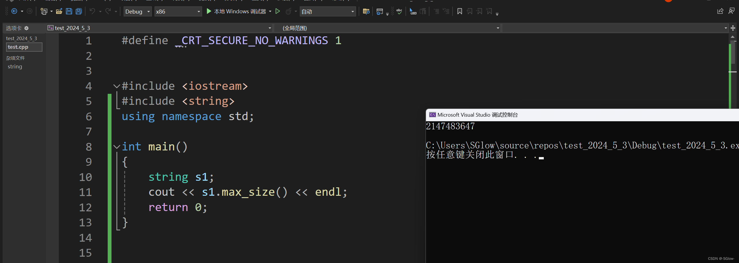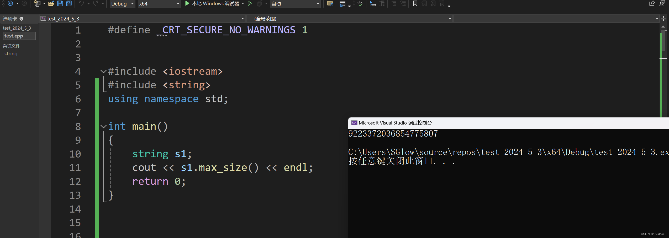 用来查询字符串允许的最大长度,几乎没什么用,因为一般情况不会触及到这个最大值,下面是在x64下允许存储的最大长度,相当于有符号long int能存的最大值,需要8589934592G的空间,这是不可能达到的。
