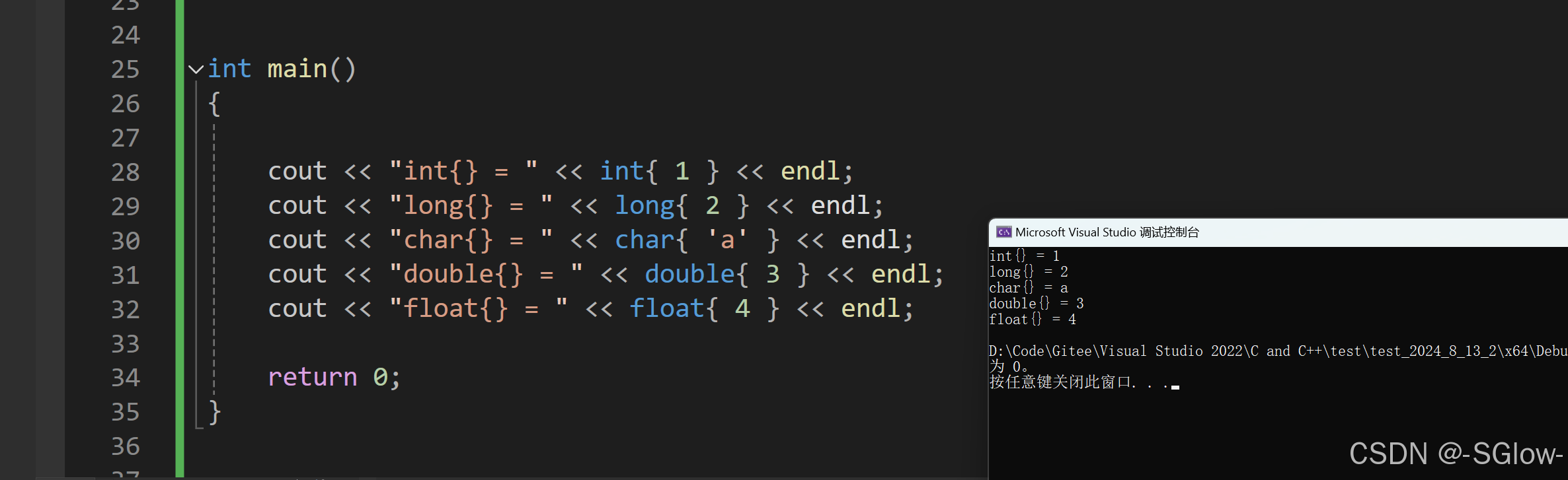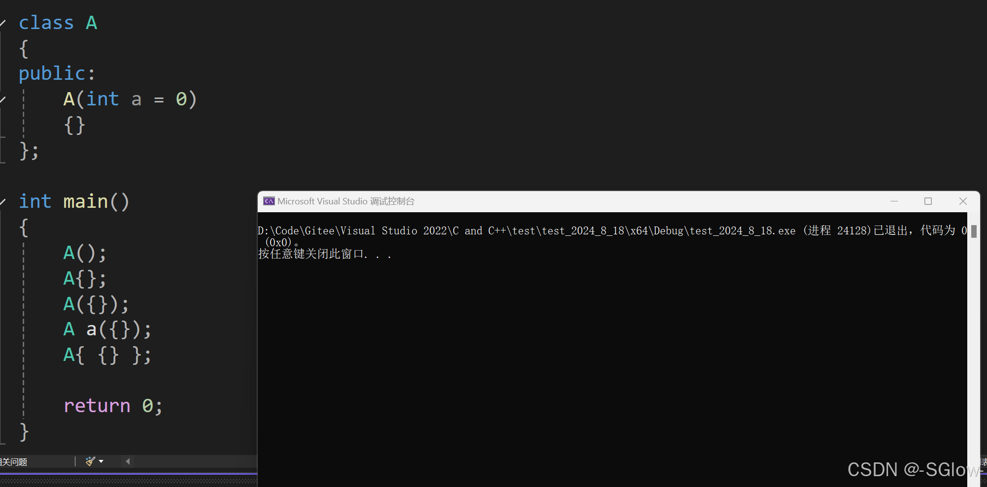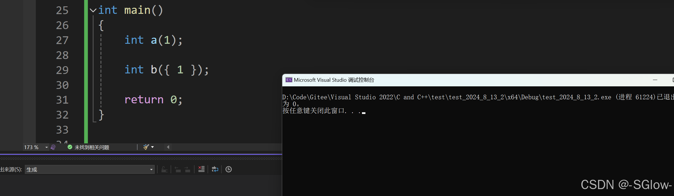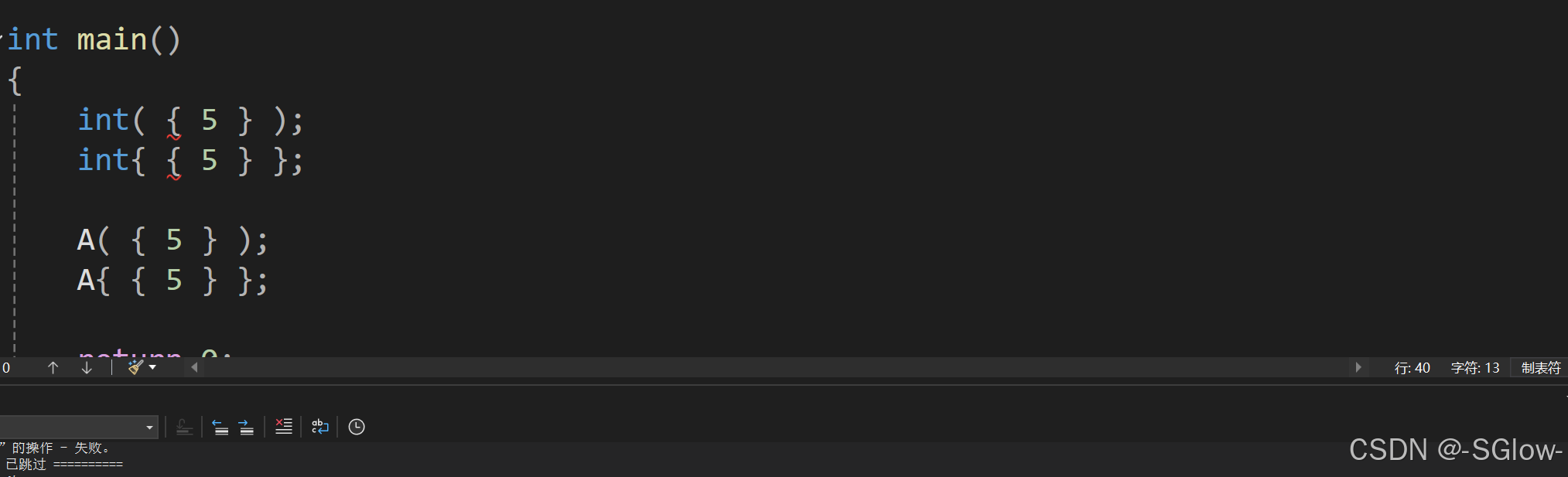 同时,“不带赋值号初始化”是一种选择,我们也可以像上面结构体和数组的初始化规则那样加上赋值号,这样的话struct、数组、内置类型在初始化上实现了大统一,都可以使用 = { }或者单独的{ },从逻辑上来说这三者在这方面的初始化规则更紧密了。
