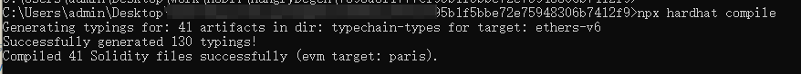 打开一个管理员cmd,进入到项目路径下,用 Hardhat 编译 contracts/ 目录中的合约,编译后项目路径会多出 artifacts/ 和 cache/ 两个目录,存编译出来的数据。