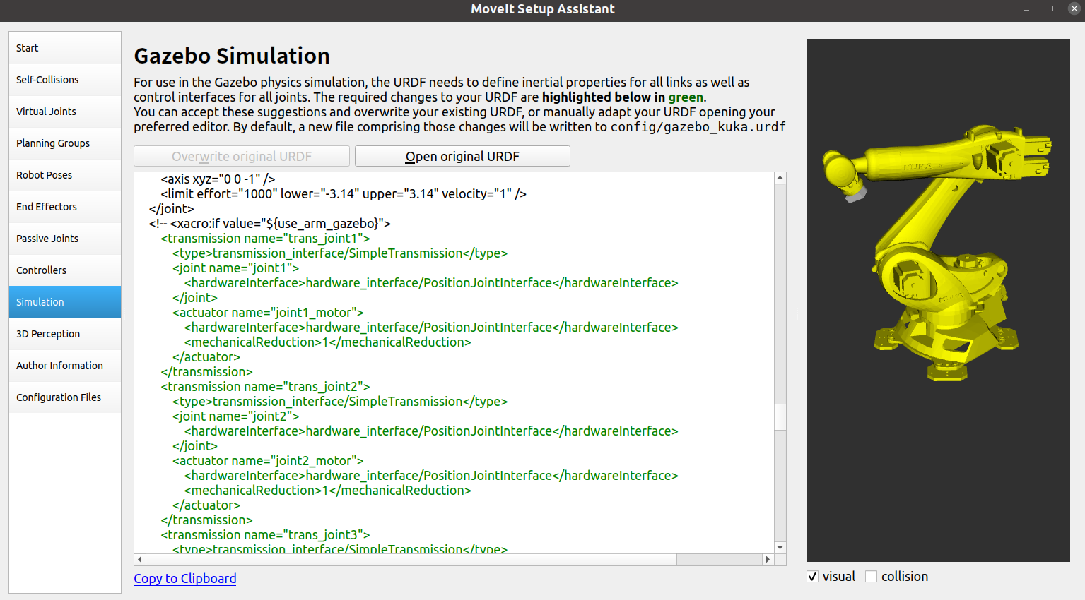 通过上面配置后,moveit会帮我们重新生成一个urdf的文件,可以直接使用这个文件,或将绿色修改内容复制到自己的urdf或xacro中。