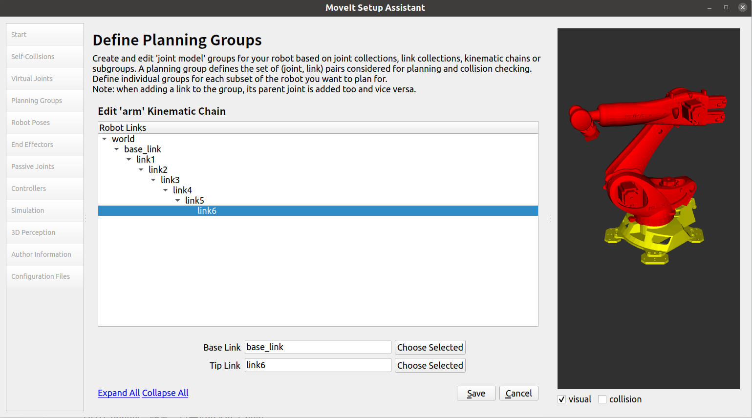 这里选择Base Link为base_link,Tip Link为link6,点击Save保存,完成机械臂组创建