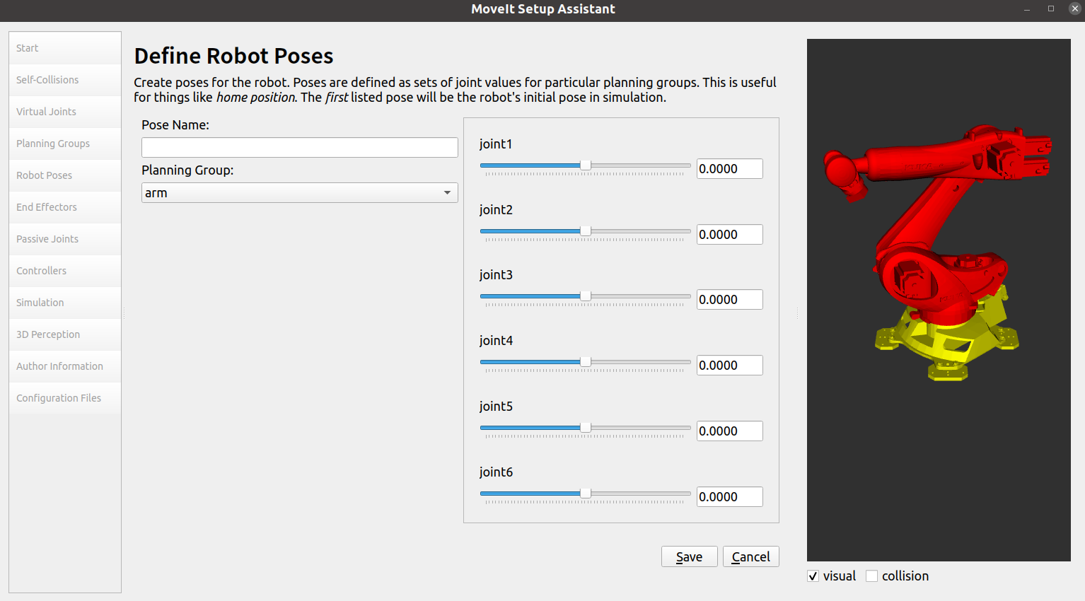 这里添加一个或则多个姿态,在rviz中可以快速修改姿态,点击Add Pose添加姿态,Pose Name命名姿态名,Planning Group选择组,然后给关节赋值-3.14~3.14,点击Save保存。