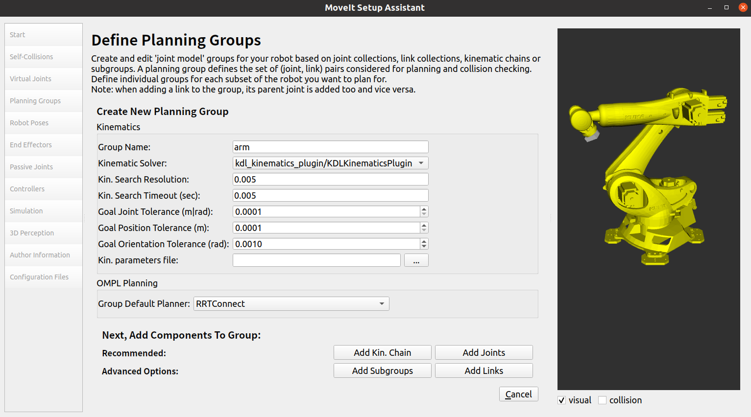 这里的Group Name填arm,然后Kinematic Solver选择kdl_kinematics_plugin/KDLKinematicsPlugin,其他不变,然后Group Default Planner选择RRTConnect,配置完点击Add Kin. Chain