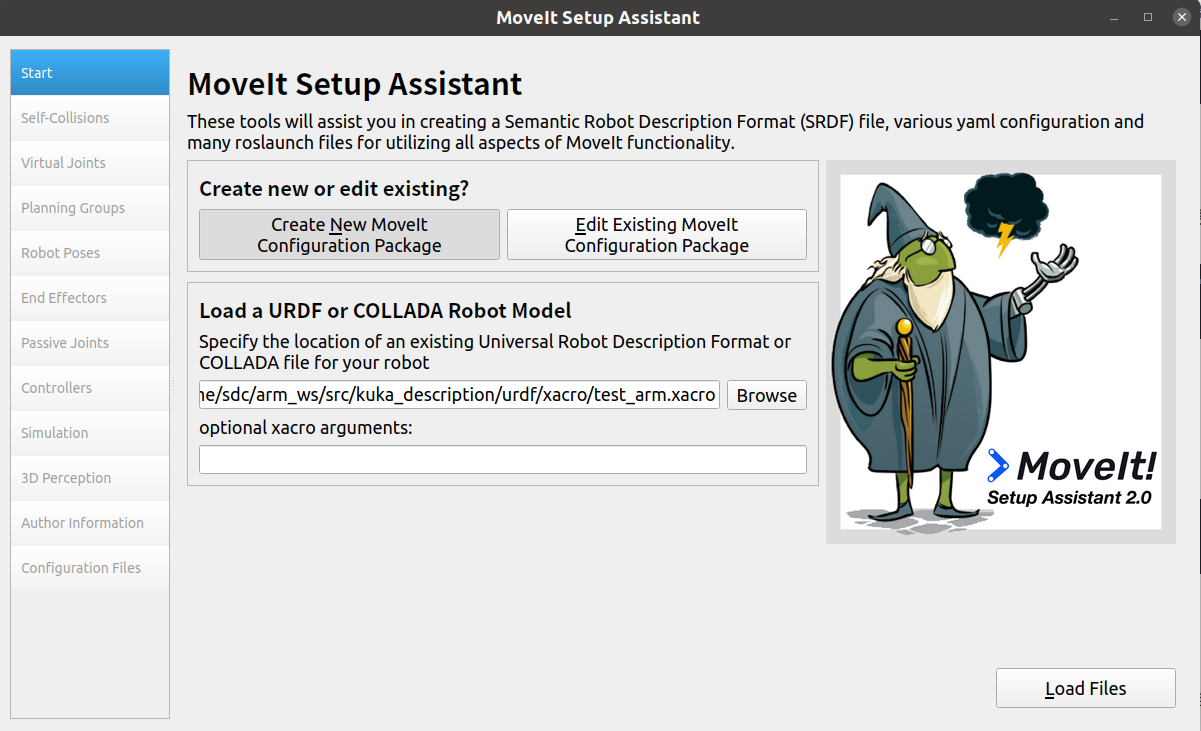 点击创建新的配置包Create New Moveit Configuration Package后点击Browse,选择urdf或xarco文件,然后点击右下角的Load Files。