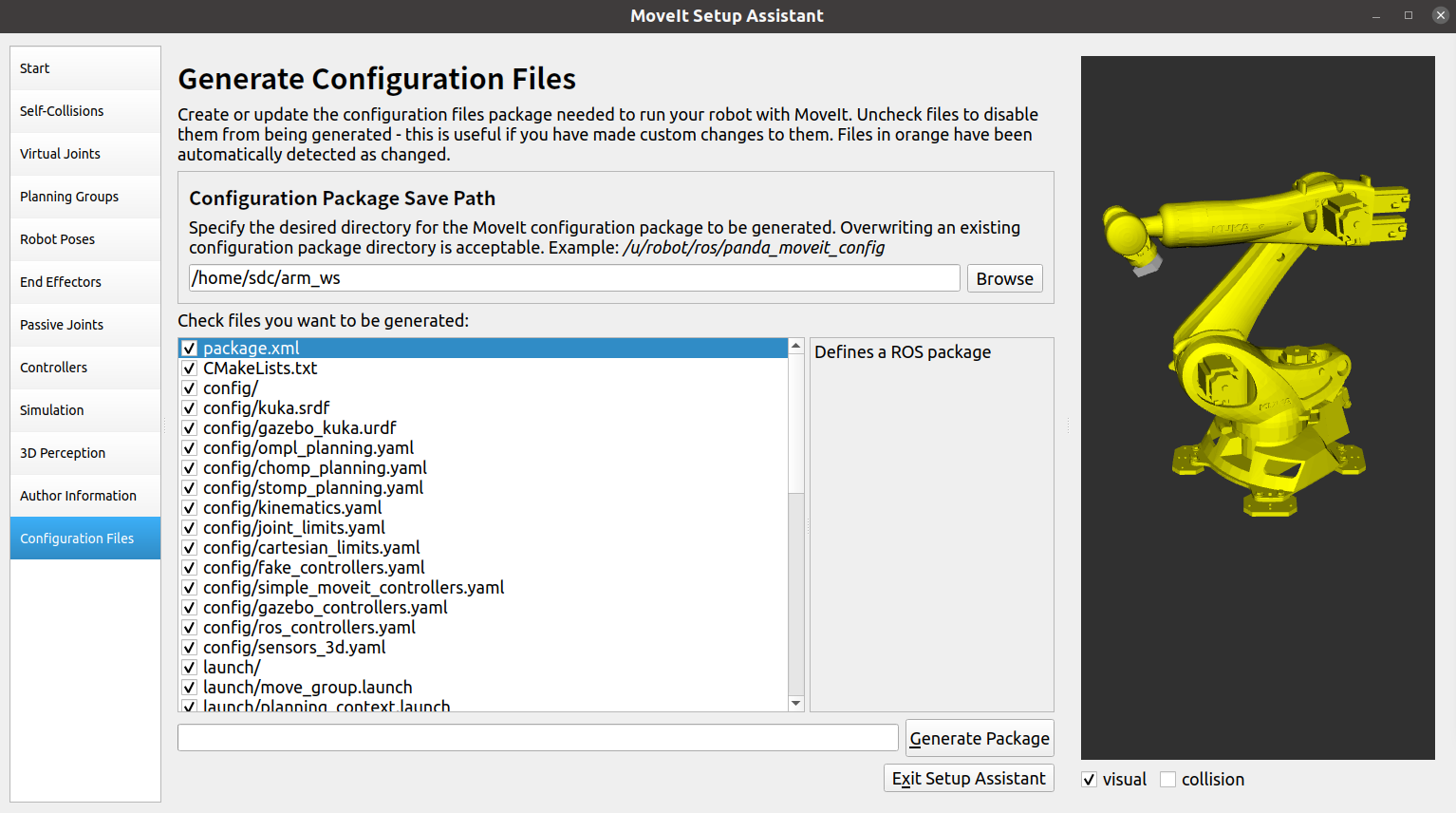 点击Browse在src下创建一个新的arm_moveit_config包,然后点击Generate Package创建