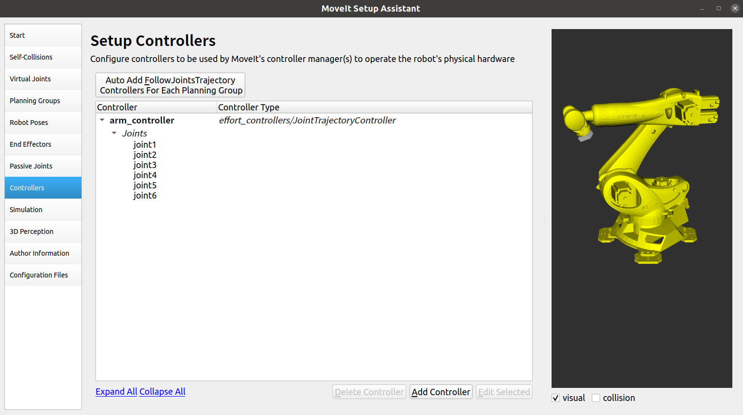 点击Auto Add FollowJointTrajectory Controllers For Each Planning Group生成控制器配置
