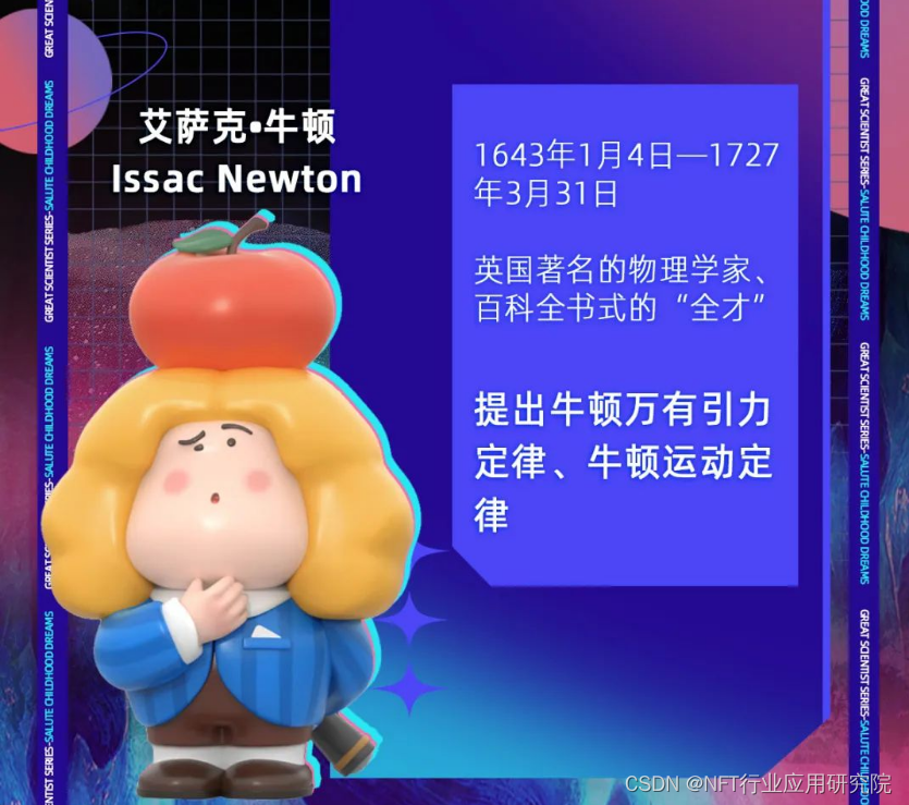 1、中国科技馆首发官方数字藏品大科学家系列,该系列首期选择了历史上耳熟能详的7位科学家,毕昇、蔡伦、祖冲之、张衡、牛顿、爱因斯坦、居里夫人,并创作了对应的3D科学家形象数字藏品,每个形象发行2000份。
