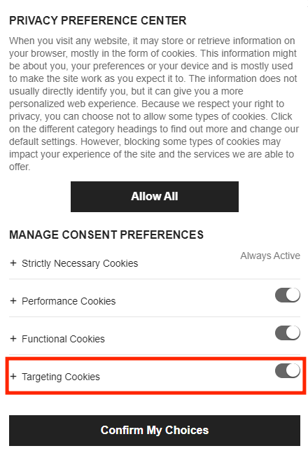 以某购物网站的cookies偏好选择为例,用户在首次进入网站时便会出现cookies设置弹窗,用户可自主选择是否同意网站将收集到的个人信息用于自动化推荐等业务。