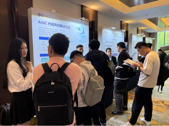 数美科技现场携AIGC内容风控解决方案参展,展现了在AIGC内容安全领域的实力与高效实践,展位前人气火爆,来自全球的AI开发者及行业莅临展位,共同探讨交流AI发展趋势与AIGC内容安生态的发展。
