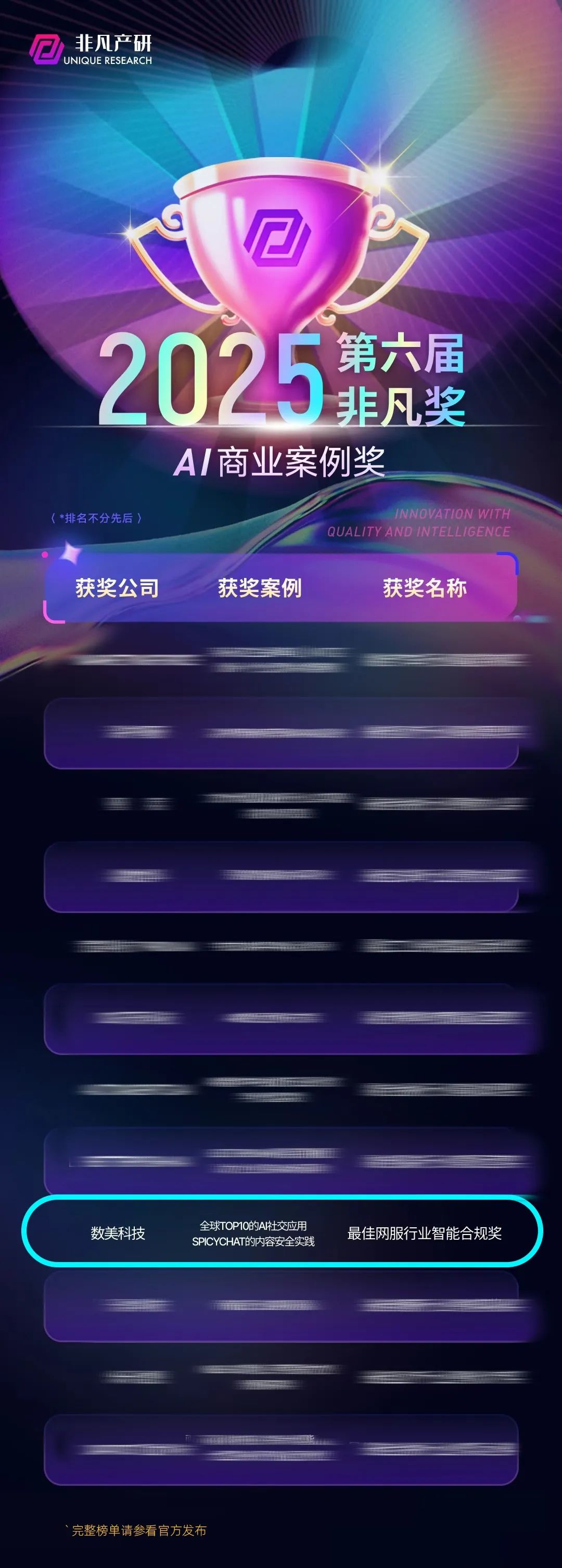数美科技凭借着全球Top10的AI社交工具SpicyChat.Ai的内容安全实践案例,斩获2025「非凡奖—AI商业案例奖」。
