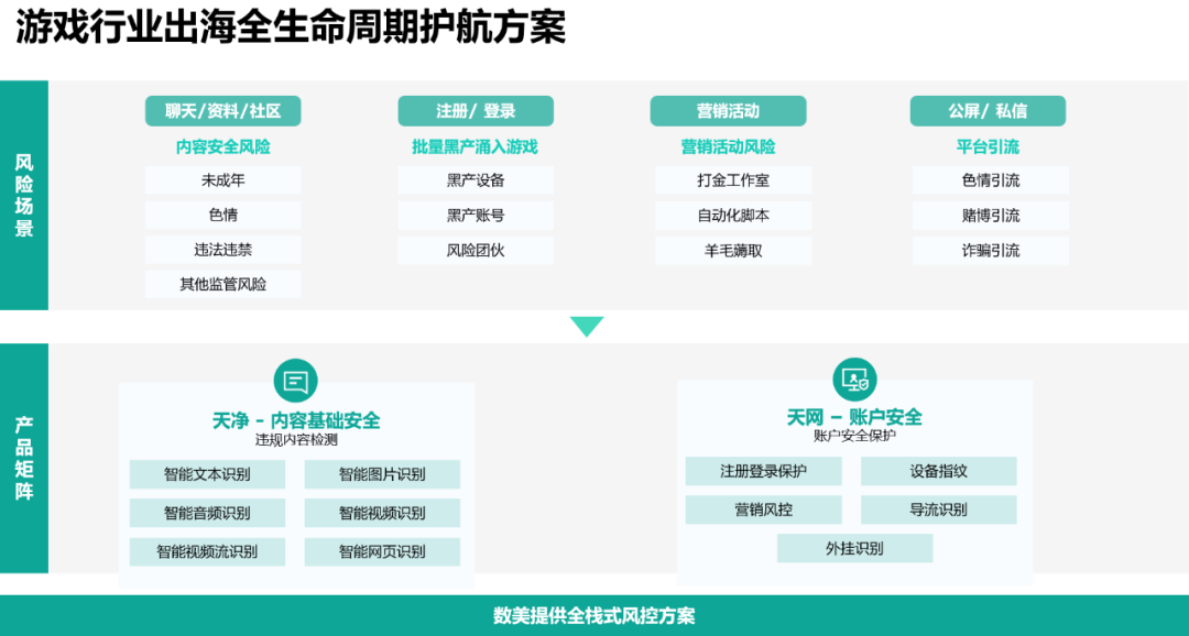 针对游戏出海从准入合规、生态治理到增长赋能的全生命周期核心需求,这套方案正是数美科技依托自身深耕多年的全球化业务风控能力、大量游戏场景风控数据积淀及对不同地区法规文化的深刻洞察,为出海游戏厂商量身定制的全栈式风控解决方案。