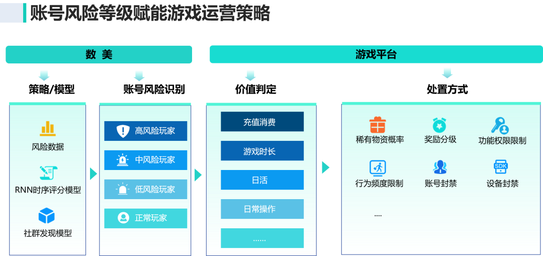 除此之外,在游戏运营中,还需结合风险数据与业务数据(充值、时长等),通过RNN时序模型等将玩家划分为四类,实施差异化策略: