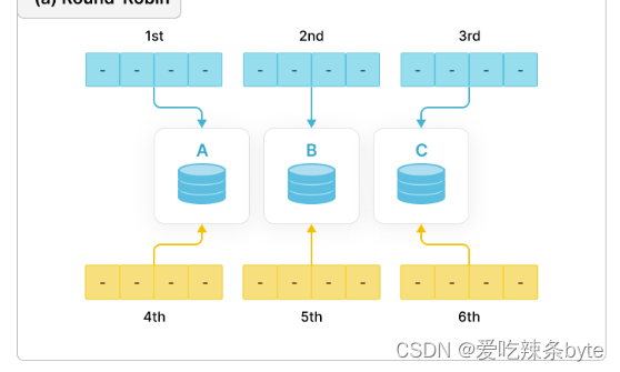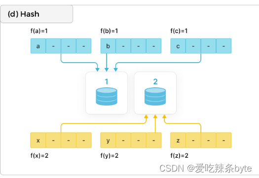 分布式数据库中常见的数据分布方式有:Round-Robin、Range、List 和 Hash。如下图所示:
