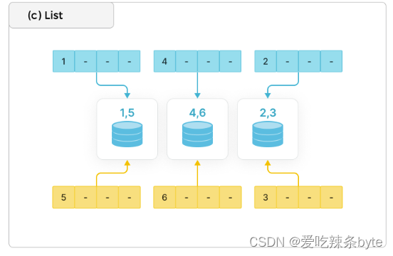 总结:可以根据具体的业务场景需求组合使用这些数据分布方式,常见的组合方式有 Hash+Hash、Range+Hash、Hash+List。