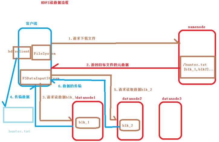 1.客户端向Namenode请求下载文件hunter.txt(200M);
