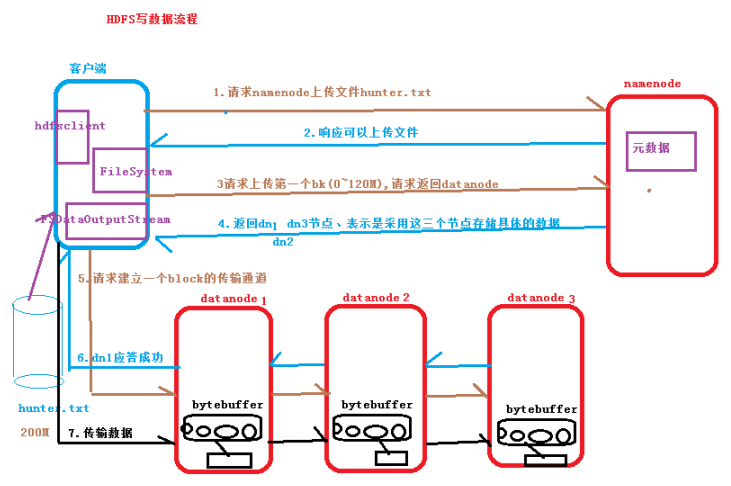 1.客户端向Namenode请求上传文件数据Hunter.txt(大小:200M);