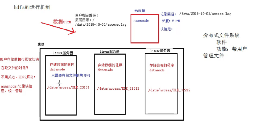 Namenode它的作用时记录元数据信息,记录块信息和对节点进行统一管理。比如用户要存储一个很大的文件,HDFS系统会对这个文件进行切分,然后存储在多台Namenode节点当中,那么每个切的大小,存储的路径信息,文件的副本数等元数据信息会存储在元数据当中,由Namenode进行管理和记录。