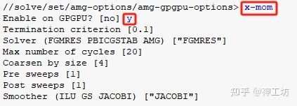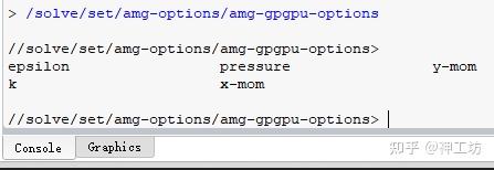 3.成功选择GPU后,在终端键入“q”直至返回最外级选项。接下来选择需要GPU求解加速的量,输入“/solve/set/amg-options/amg-gpgpu-options”将会弹出当前算例所需求解的量。