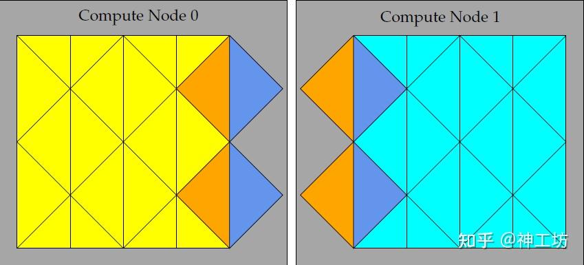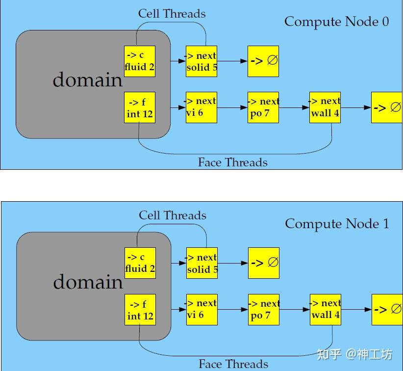计算节点负责存储并执行部分网格的计算任务,而位于分区边界的单层重叠单元格层则负责跨分区边界的通信(图2)。尽管单元格和面被分割,但网格中的所有域和线程在每个计算节点上均存在镜像(图3)。线程以链接列表的形式存储,和串行求解器保持一致。计算节点可在大规模并行计算机、多CPU 工作站或具备相同或多工作站组成的网络上实现。[1]