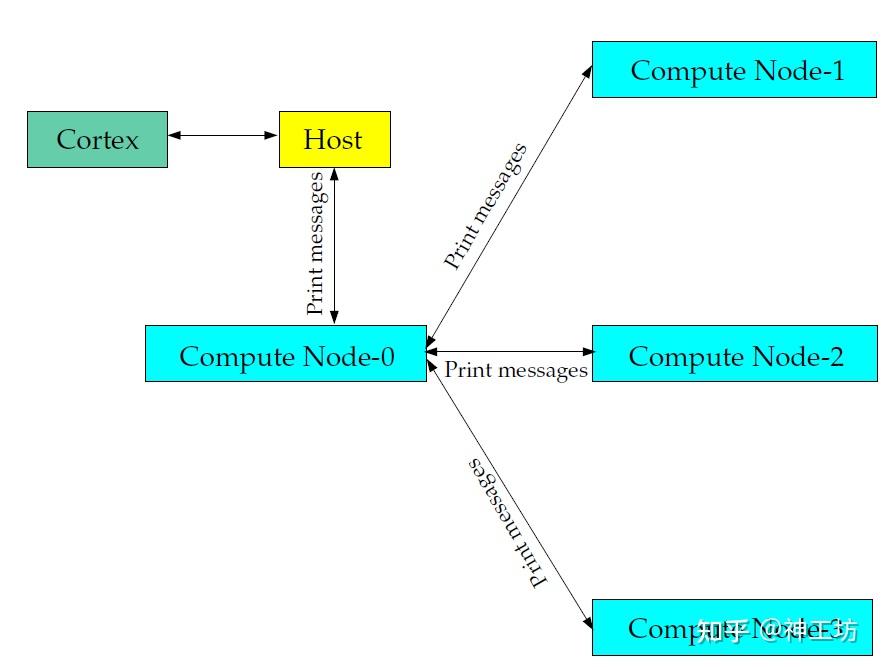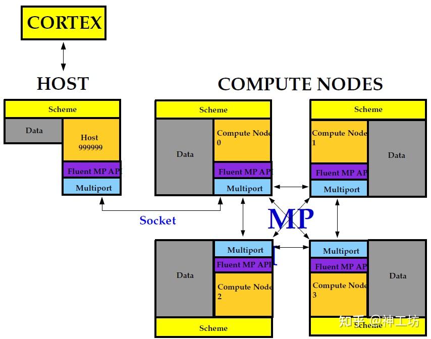 在Flunet并行计算会话中,进程涉及的主体包括 Cortex(主机进程)和一组 n 个计算节点进程,这些计算节点由 0 到 n-1 进行标记(图4)。主机进程接收来自 Cortex 的命令,并将命令传递至node-0,再由node-0发送给其他计算节点,所有计算节点(不包括节点0)均从node-0 接收命令。在计算节点将指令发送至主机之前(通过node-0),它们会相互进行同步。