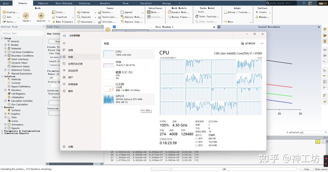 测试过程如图10所示,可以看到满状态下,CPU和GPU负载均较高,这表明加速效果显著。然而,如果算例配置需求过高,可能导致显存不足,进而引发软件崩溃,如图11所示。