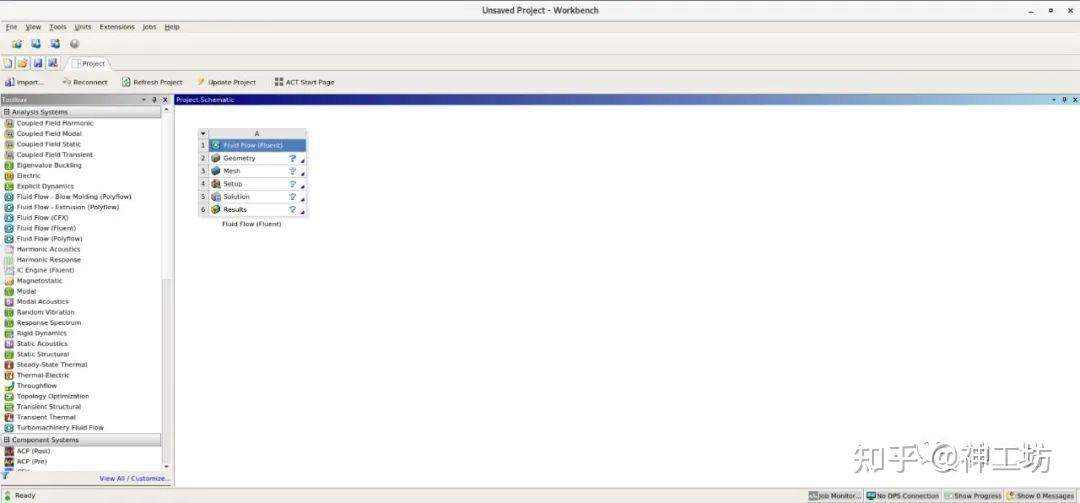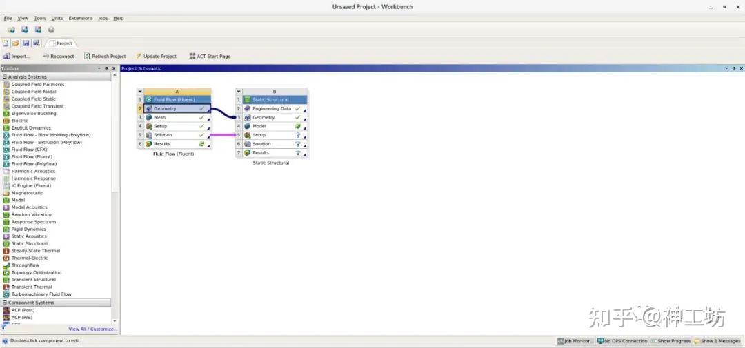 在流体求解完成之后,我们回到Workbench工作界面,拖动左侧Static Structural模块,将流场的几何与流体的计算结果链接中即可完成模型与流场压力的传递。