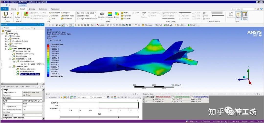 点击Static Structural模块中的Model,进入结构模块,对飞机机身的进行网格划分,设置相关求解参数,将流场压力加载到相应的流固耦合面,进行结构求解。结构求解完成之后选择机身的变形云图以及应力云图进行显示。