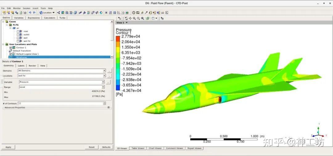 流体求解完成后,可在Workbench中查看后处理云图,点击Result即进入CFD-POST,选择显示飞机机身的压力云图,在接下来的固体求解计算中也是导入流体求解的表面ya结果,进行机身的刚度变形以及应力求解。