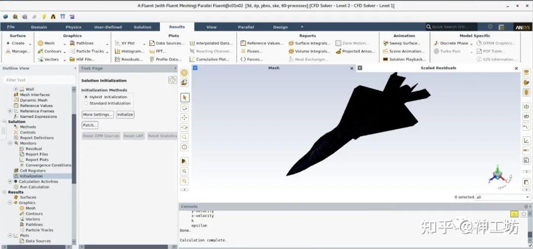 在Workbench中拖动左侧工具栏选择Fluent流体软件,在Geometry栏导入本次的飞机模型,点击Mesh进行相应的网格划分,网格完成之后点击Setup进入到Fluent界面设置相应的计算参数进行求解。如图所示,求解过程中可以实时观测残差和监控参数以便及时改正参数(笔者在第一次计算就出现了因湍流模型选择不当,而导致残差未呈现收敛趋势,于是及时暂停计算,并修改了湍流模型,若是非原生界面操作,无效计算不仅浪费了余额,而且还会影响项目的进展)。