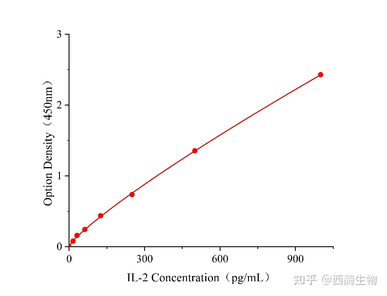 试剂盒采用双抗体夹心法ELISA技术:将捕获抗体包被于酶标板上,捕获样品及标准品中的待测物IL-2,清洗后,再加入生物素标记的检测抗体进行孵育后清洗,形成“捕获抗体-抗原-检测抗体”免疫复合物,随后加入链霉亲和素偶联的辣根过氧化物酶进行孵育,待孵育结束后清洗,接着加入TMB显色后,若样本中有待测物则显蓝色,加入终止液停止反应。检测过程中游离的成分均被洗去,用酶标仪在450 nm处测OD值,颜色的深浅和样品中的待测物的含量呈正比,通过绘制标准曲线计算出样本中IL-2的浓度。