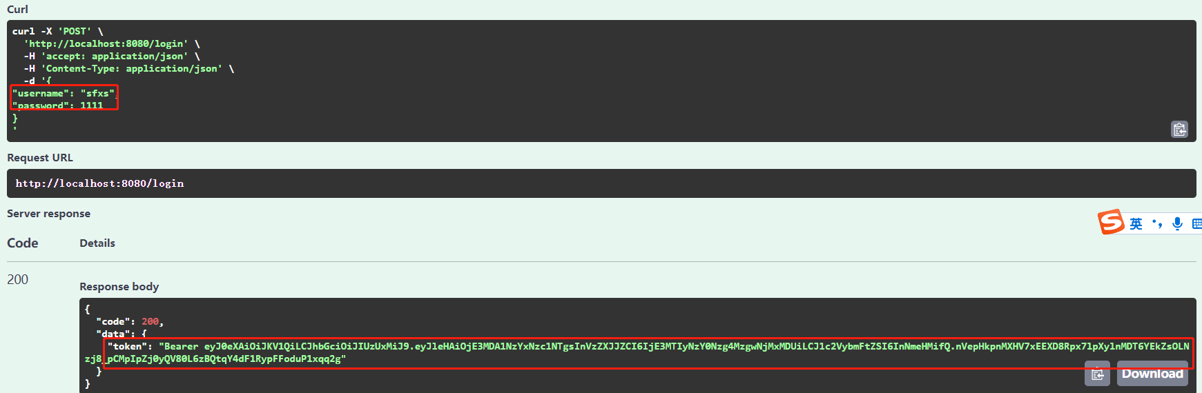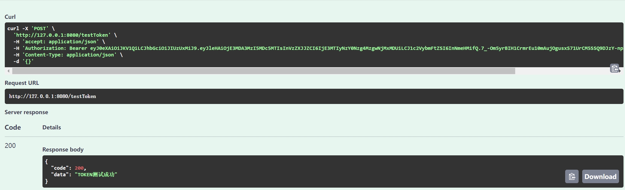 应用启动后,我们在Swagger页面首先登录获取Token,然后设置Token,访问testToken接口,效果如下