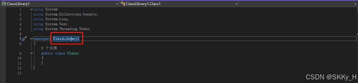 确定需要修改的命名空间名称(ClassLibrary1)以及所在的工程(ClassLibrary1)。