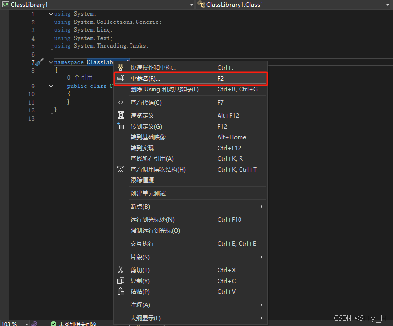右键选中需要修改的命名空间名称(ClassLibrary1),选择"重命名"。