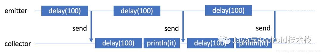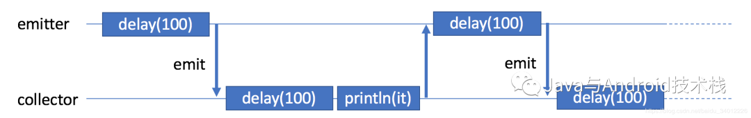 如果熟悉 RxJava 的话,则可以理解为 collect() 对应 subscribe(),而 emit() 对应 onNext()。