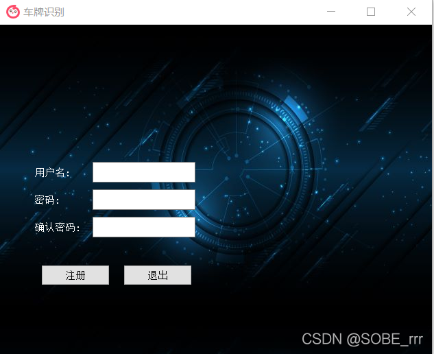 这是一个使用PyQt5构建的用户注册界面,用于车牌识别系统的用户注册功能。界面包括用户名、密码和确认密码的输入字段,以及注册和退出按钮。点击注册按钮会触发登录检查,验证输入内容的非空性和密码一致性,并检查用户是否已存在于用户列表中。如果所有验证通过,用户信息会被保存并关闭注册界面,返回主界面。
