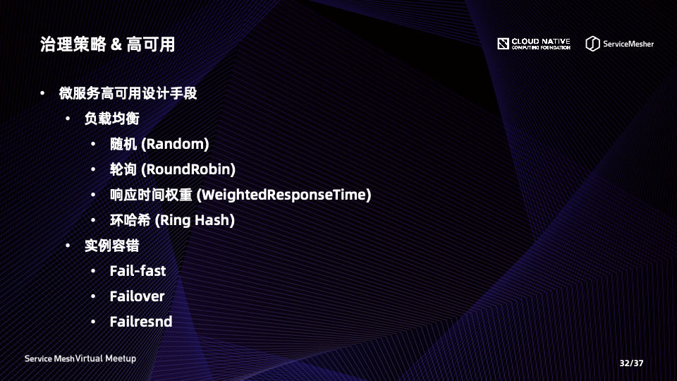 最后,我们来看一下智能路由带来的高可用。智能路由这里包括(客户端)负载均衡与实例容错策略。对于 Spring Cloud 框架来说,这部分能力由 Ribbon 来提供,Ribbon 支持随机、轮询、响应时间权重等负载均衡算法。而对于 Service Mesh 框架,这部分能力由 Envoy 提供,Envoy 支持随机、轮询(加权)、环哈希等算法。为了实现两套系统的规则统一对齐,可以采用其交集。
