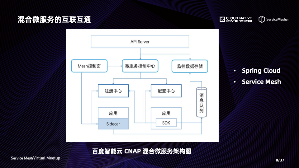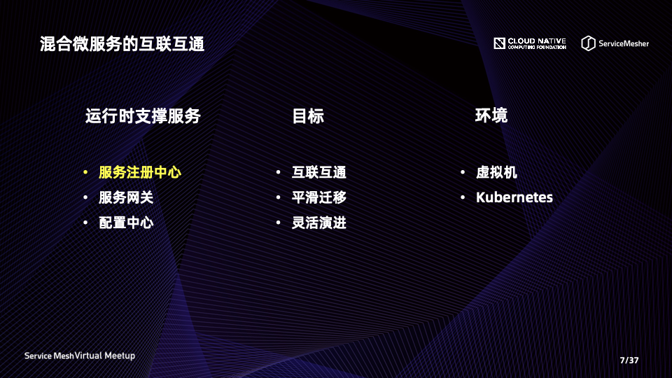 这里还包括对应用运行平台的要求,即两个体系下的应用,既可以运行在虚拟机之上,也可以运行在容器/K8s 之上。我们不希望把用户绑定在 K8s 上,因此 Service Mesh 没有采用 K8s 的 Service 机制来做服务注册与发现,这里就突出了注册中心的重要性。