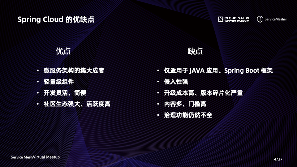 首先,我们来看一下 Spring Cloud 这个传统侵入式微服务框架。它包含以下优点: