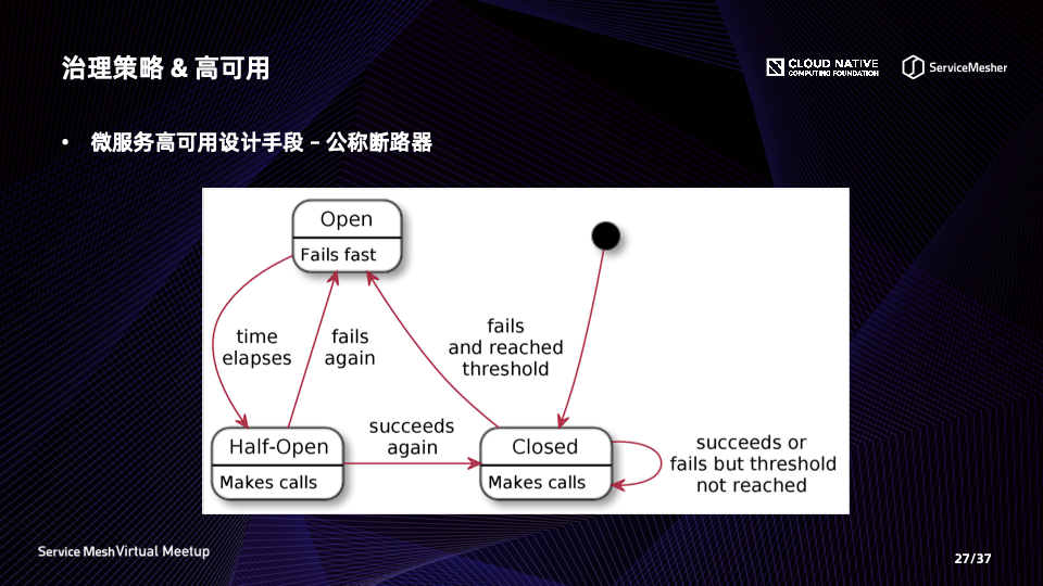 没有半开放的状态。然而,断路器持续打开的时间取决于被调用服务之前失败的次数,持续的故障服务将导致断路器的开路时间越来越长。
